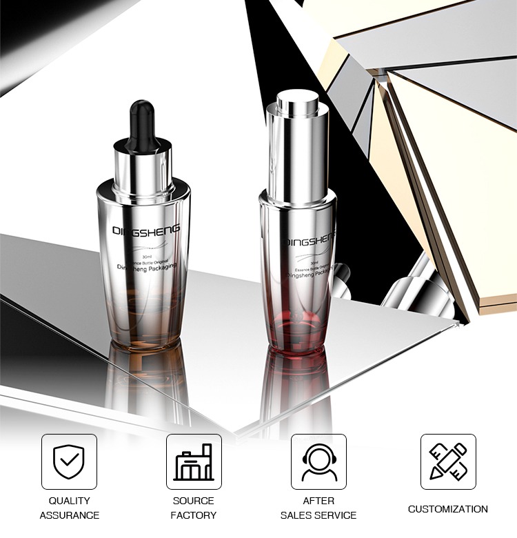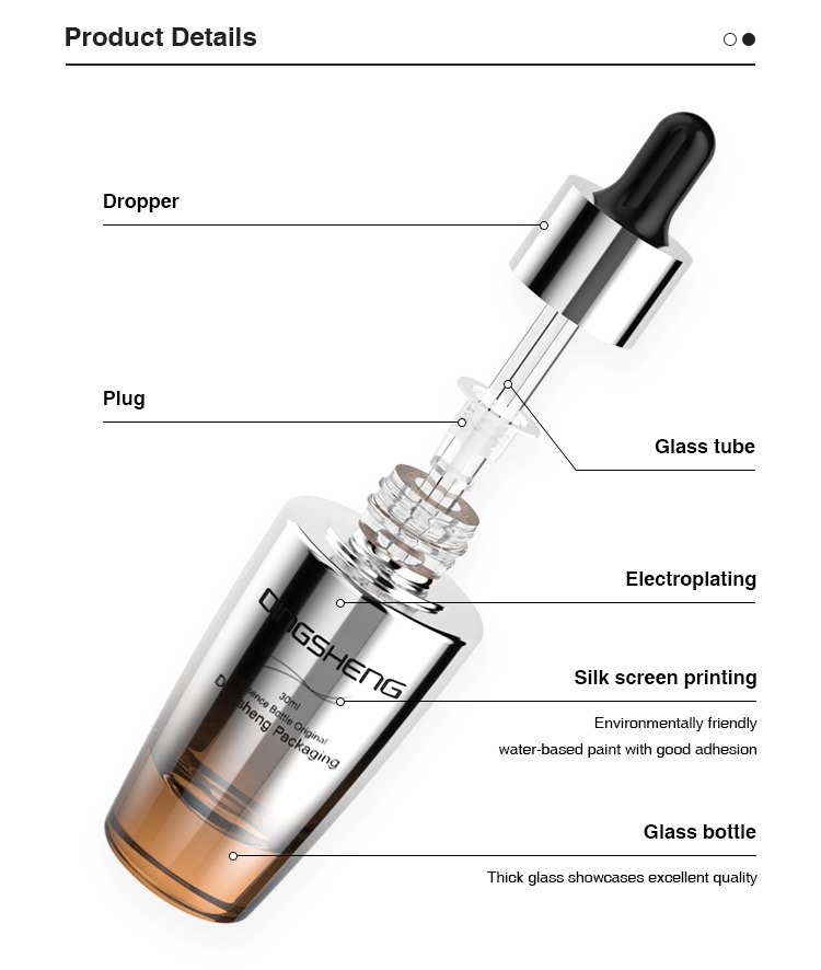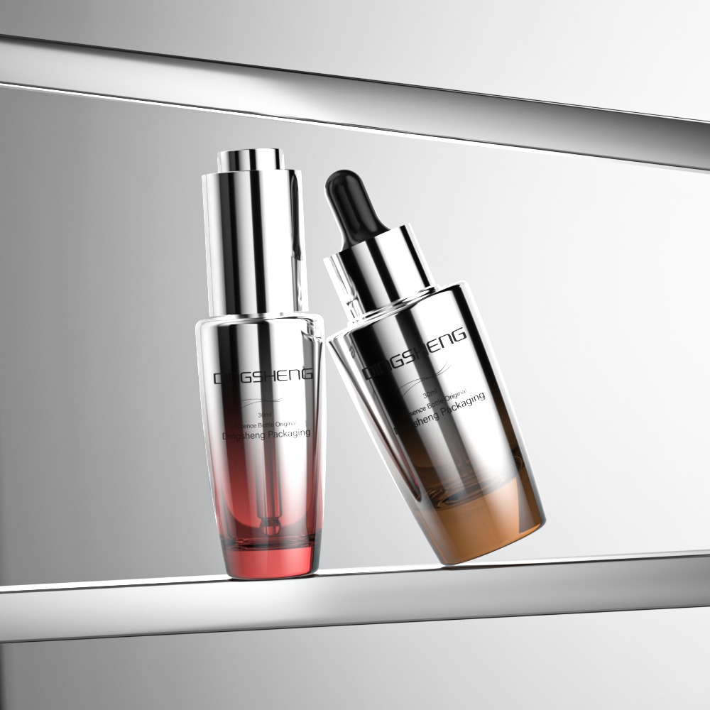 Spray Painting / ElectroplatingThe 30ml Electroplated Gradient Pump Dropper Bottle is an elegant and practical packaging solution designed for essence, serum, and essential oil products. Crafted from premium glass with a luxurious electroplated gradient finish, this dropper bottle combines beauty and functionality, providing both visual appeal and excellent product protection. The semi-transparent design allows easy monitoring of the remaining content, while the precision pump dropper ensures clean and controlled dispensing, preventing waste and contamination.