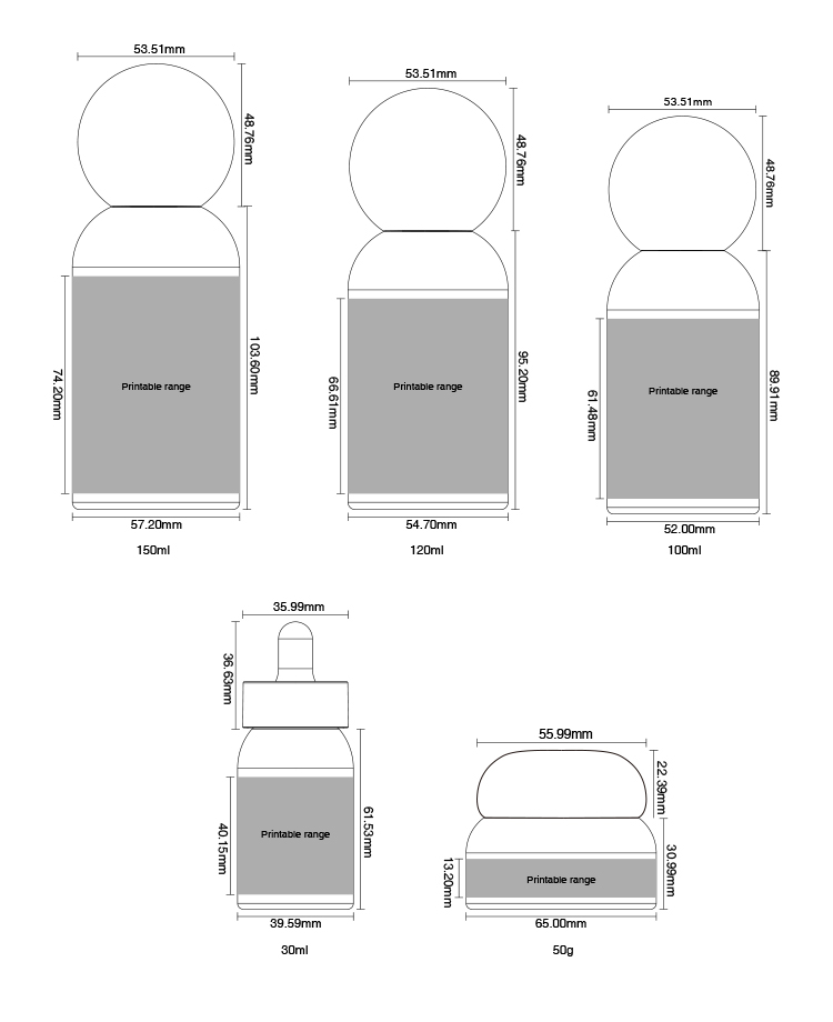 سعة متعددة الاستخدامات تشمل جميع المنتجات: تم تصميمها بدقة بأحجام محددة (قطارة 30 مل، برطمان 50 جم، وزجاجات 100 مل/120 مل/150 مل) لتناسب بسلاسة مجموعة كاملة من منتجات العناية بالبشرة الاحترافية، من الأمصال المكثفة إلى لوشن الجسم اليومي.