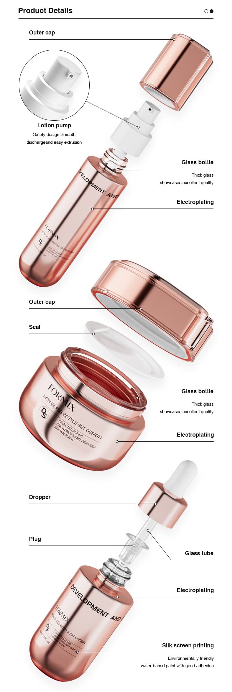 Luxury Rose Gold Glass Cosmetic Bottle Set with Custom Logo for Skincare Packaging