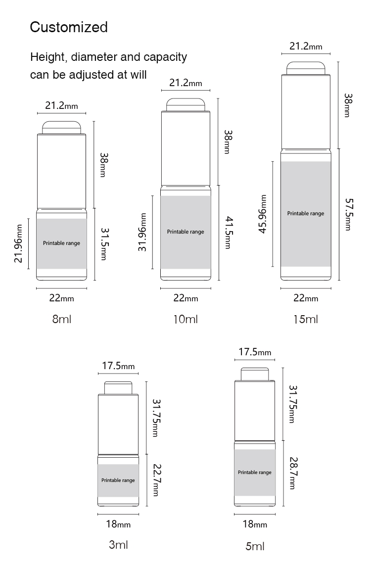 Silk Screem PrintingCrafted from thick glass, the bottle exudes a high-end premium feel, while its surface adopts eco-friendly water-based ink silk screen printing and smooth spray painting—boasting strong color adhesion, a sleek finish, and eco-conscious appeal. The compact 5ml capacity makes it perfect for on-the-go skincare routines, delivering both practicality and sophistication to meet all packaging needs for essential oil products.